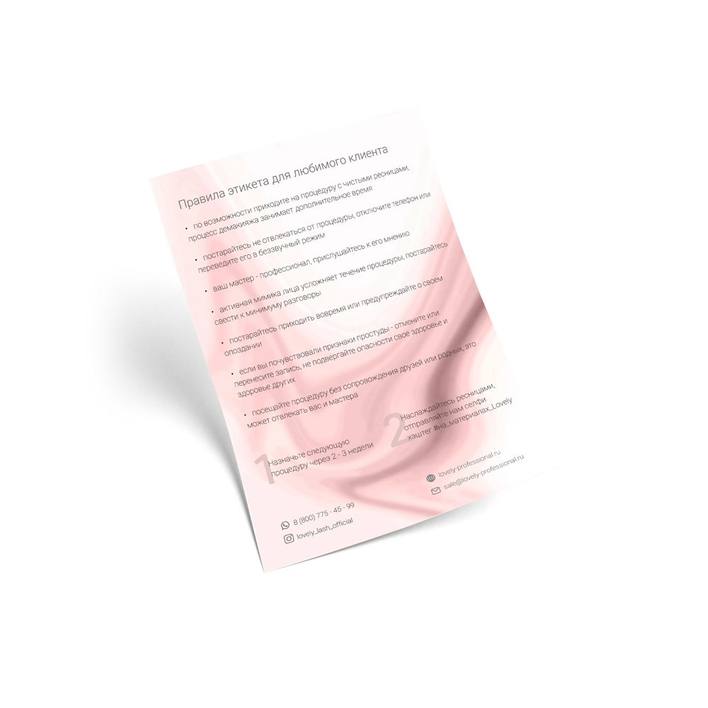Памятка любимого клиента представляет собой карточку, где собраны основные правила по уходу за наращенными ресницами. Памятка является авторской разработкой, у которой нет аналогов. Памятка напечатана на высококачественной бумаге, отличается ярким дизайном и небольшими размерами. Клиенту будет приятно получить такую карточку после процедуры, ведь это говорит дополнительно о заботе мастера.
